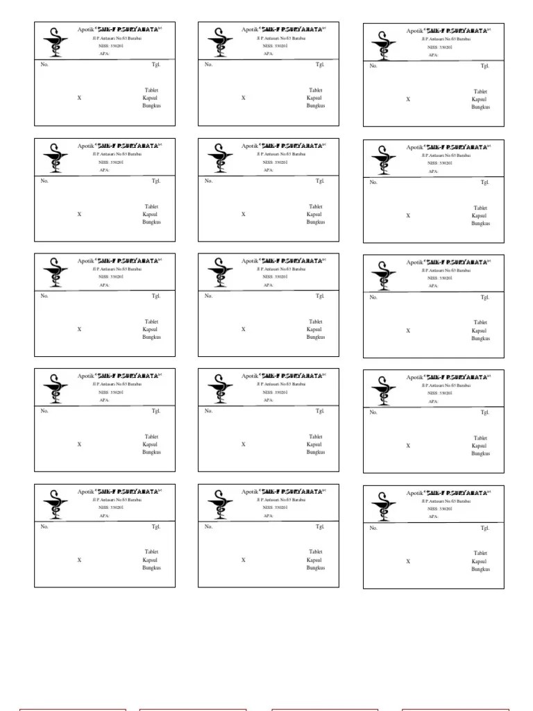 Singkatan bahasa latin dan artinya : Da 1/5 berikan 1/5 dari total keseluruhan resep . Contoh perhitungan dosis obat dalam resep. Dari resep diketahui untuk membuat 10 bungkus serbuk sediaan, mengandung 0,5 mg atropin sulfat setiap bungkus, aturan pakai 3 kali sehari satu . Komponen obat di dalam resep → bagi dosis dengan jumlah bungkus serbuk contoh: